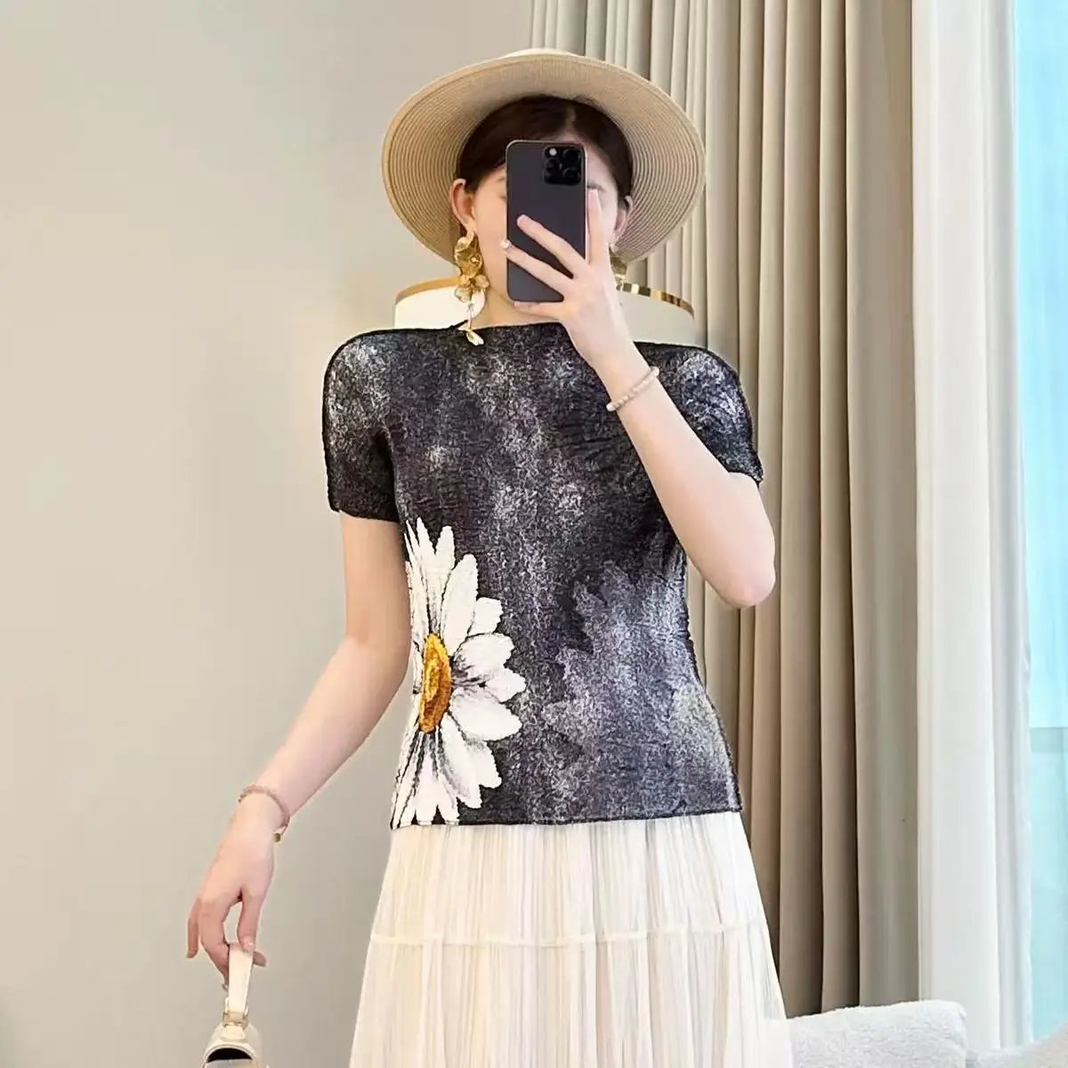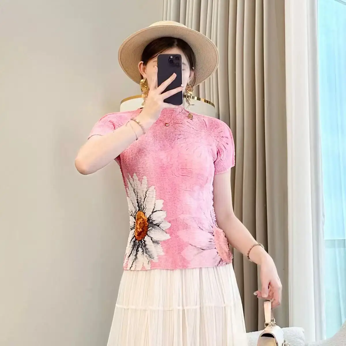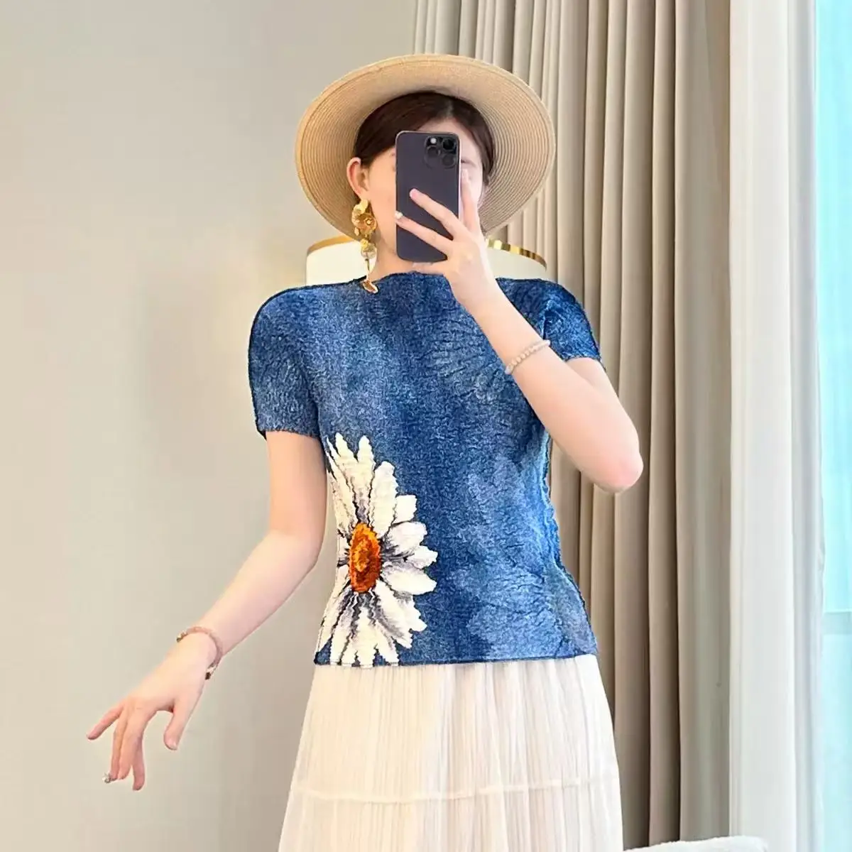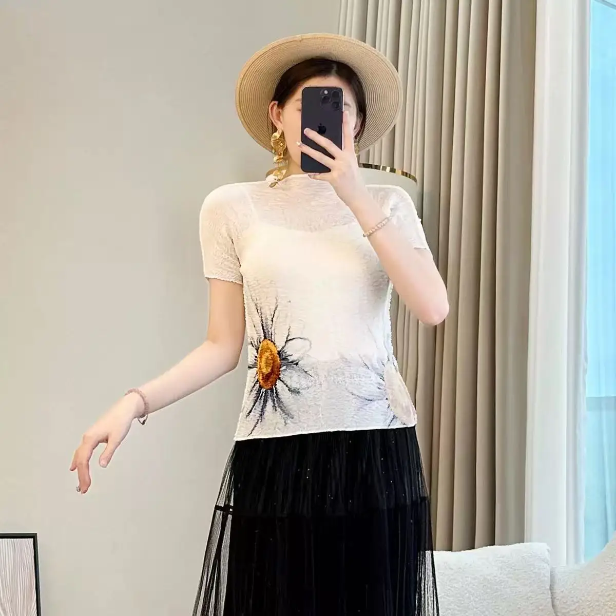Summer Women's Short-Sleeved Floral Printed T-Shirt Niche Design Pleated Joker Embossed Round Neck Top